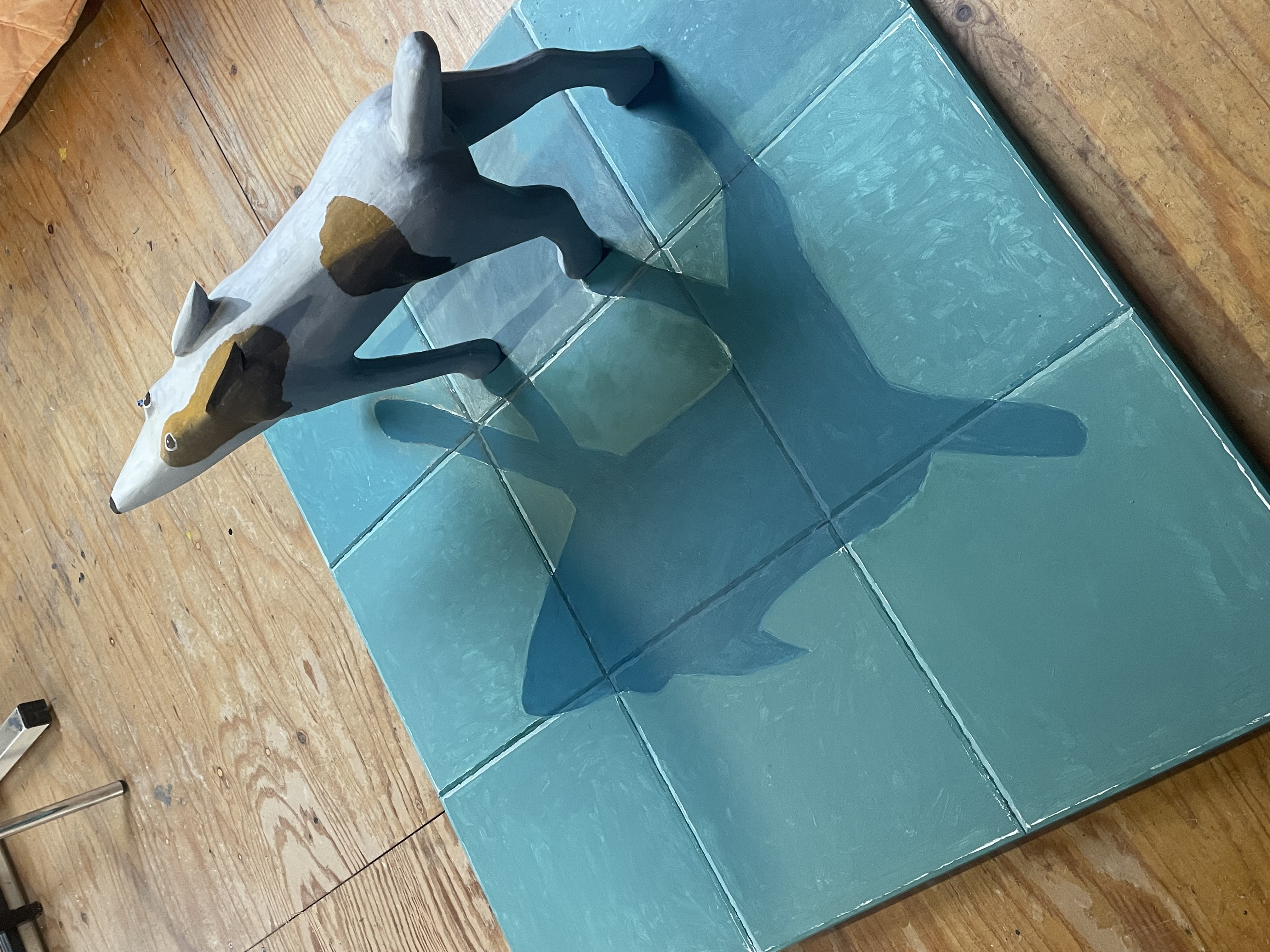 De schaduwwerpende hond krijgt in plaats van echte tegels, geschilderde tegels. Dat moet het geheel tilbaar maken en kan ik het ook op de muur bevestigen.Lees meer >> | 11 keer bekeken